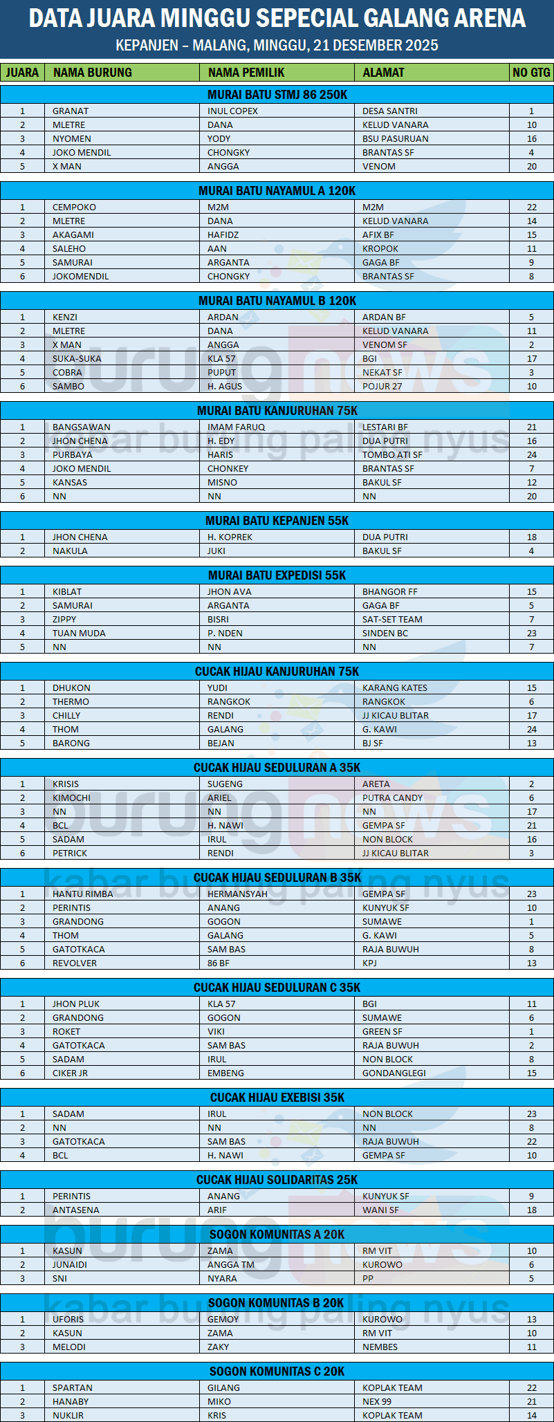 DATA JUARA MINGGU SPECIAL GALANG ARENA, KEPANJEN – MALANG