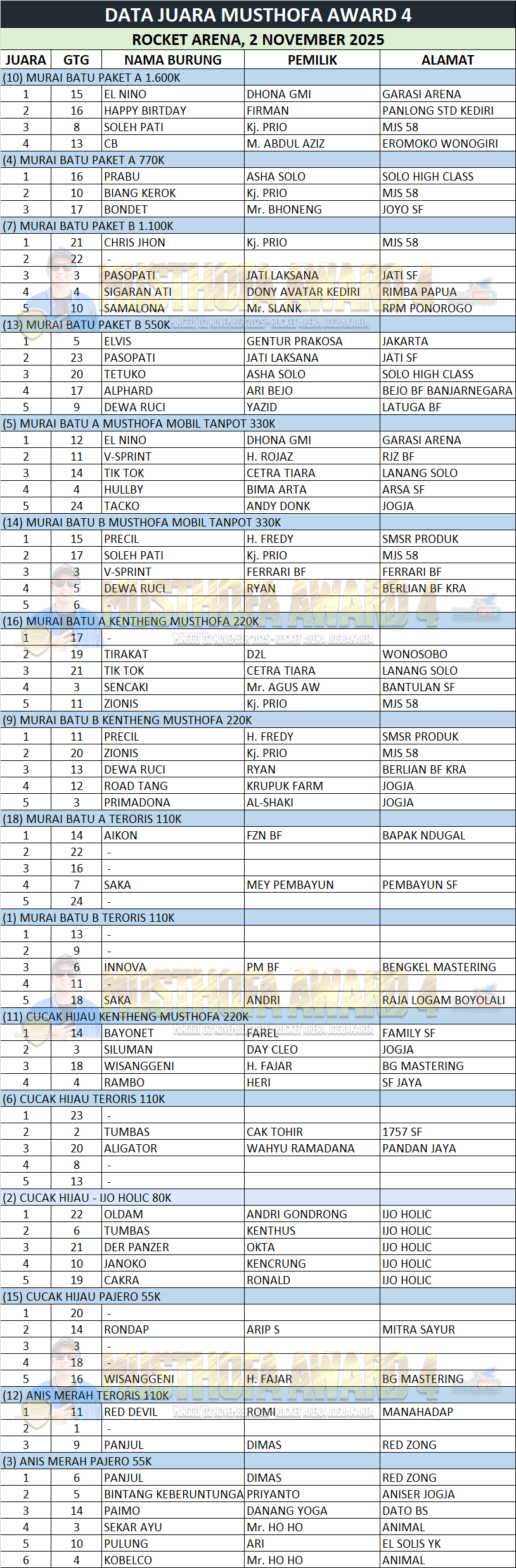 “Alhamdulillah sekali. Secara umum khususnya murai bisa dikakatan full semua. Cucak hijau juga penuh-penuh. Anis merah saja yang akhirnya tidak jadi naik semua. Saya bahagia sekali, alhamdulillah cuaca yang sempat kita kawatirkan juga hari ini di sini sangat mendukung.”