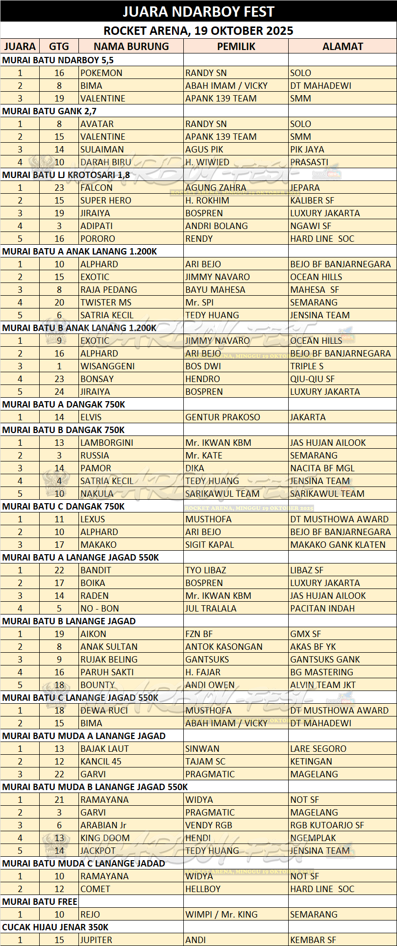 Siapa para juara di Ndarby Fest, bisa dilihat di bawah ini. Demikian pula sejumlah lomba penting dan menantang berikutnya, bisa dilihat beberapa brosur rekom dan link semua brosur – jadwal lomba.