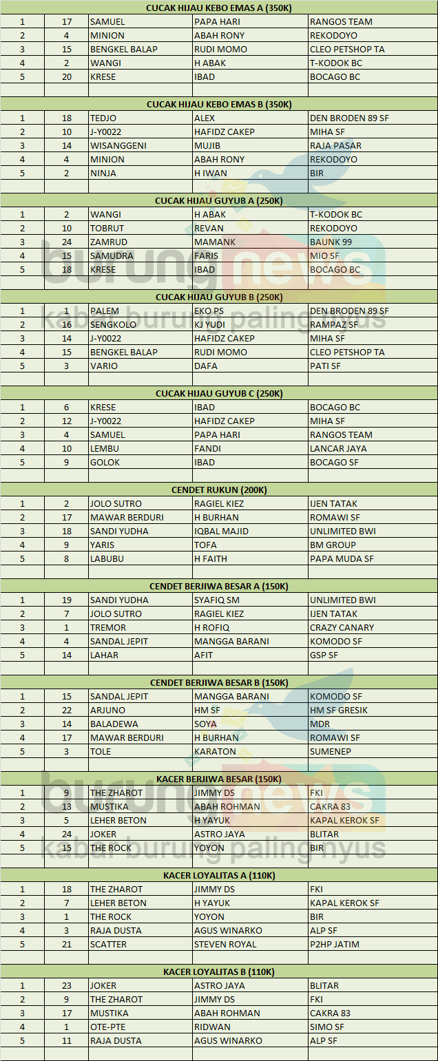 “Terimakasih kepada semua kicaumania yang hadir, kami dari pihak SGS sebenarnya sudah ada rencana untuk memanjakan pemain cucak hijau dengan memberikan hadiah mobil, seperti gelaran saudara tua saya di Malang yang sudah mau bikin kelas cucak hijau berhadiah mobil pada tahun depan. InsyaAllah akan kami agendakan dalam waktu dekat dan ini kami khususkan kepada pemain yang setia hadir di gantangan Gagak Sakti dan SGS,” terang Kaji Said kepada awak media.