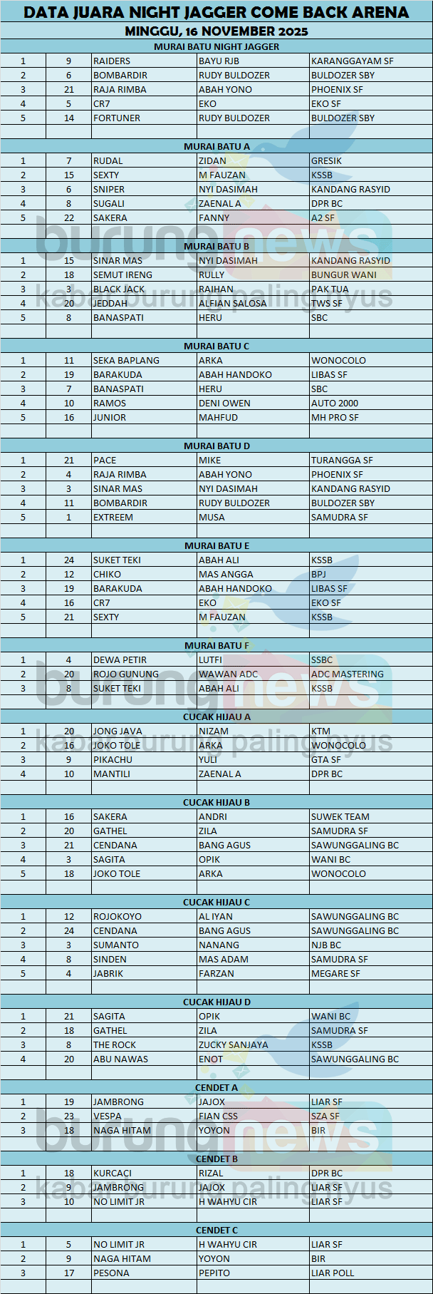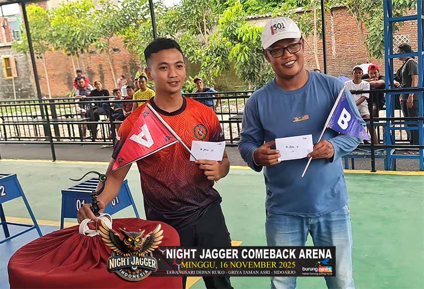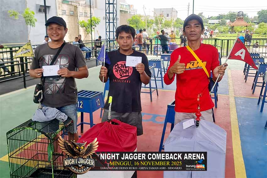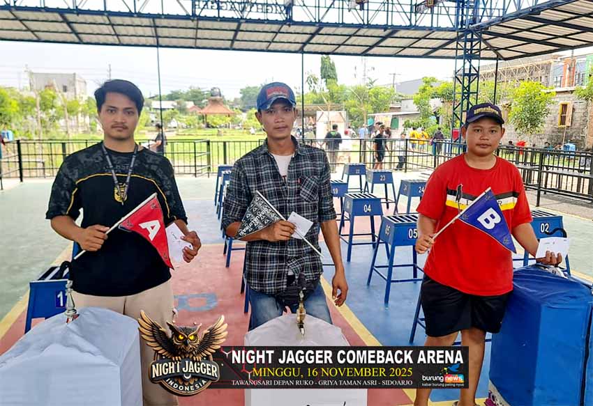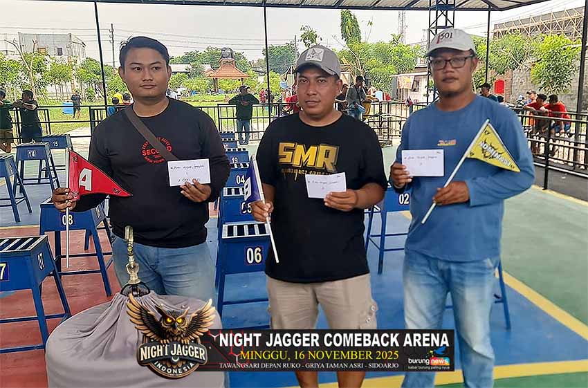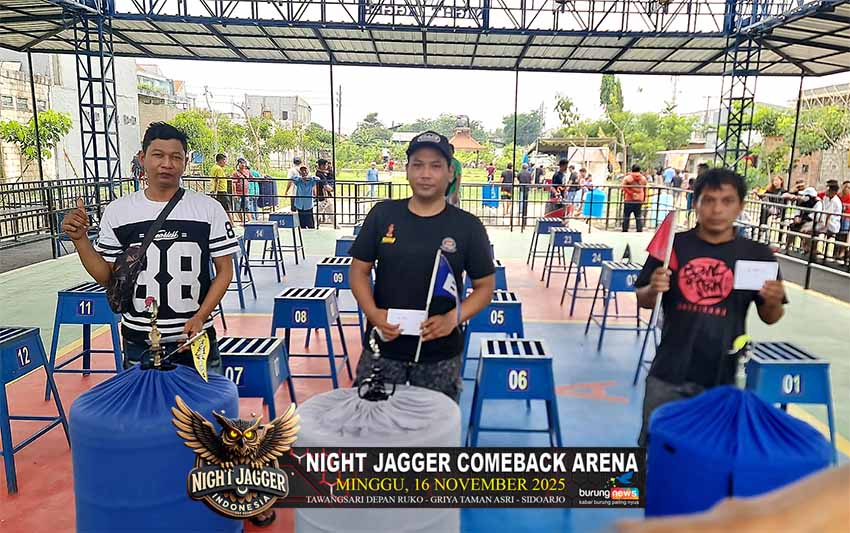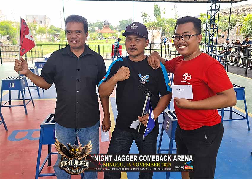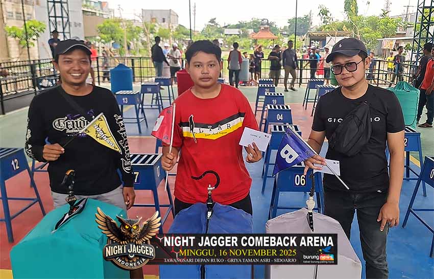 Gelaran Night Jagger Come Back Arena yang berlangsung hari Minggu, 16 November 2025 berlangsung sangat meriah pada semua kelas yang dilombakan. Tujuh kelas murai batu, Empat kelas cucak hijau dan Tiga kelas cendet.