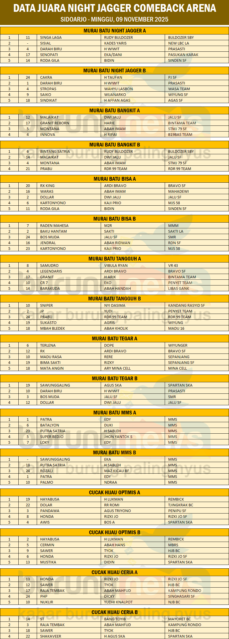 DATA JUARA NIGHT JAGGER COMEBACK ARENA - SIDOARJO (MINGGU, 09 NOVEMBER 2025)