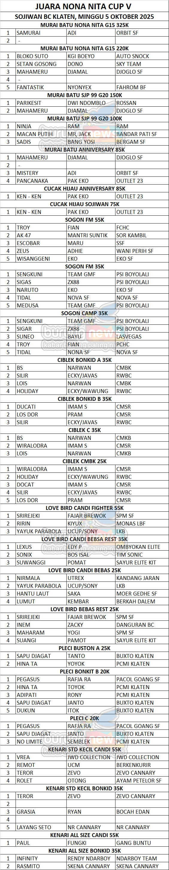 Nona Nita Cup V berlangsung Minggu, 5 Oktober 2025 di gantangan Sojiwan BC, Prambanan Klaten. Lomba diawali dengan kelas-kelas komunitas sebenyak 15 sesi, dilanjutkan dengan kelas ocehan reguler setelah jeda istirahat.