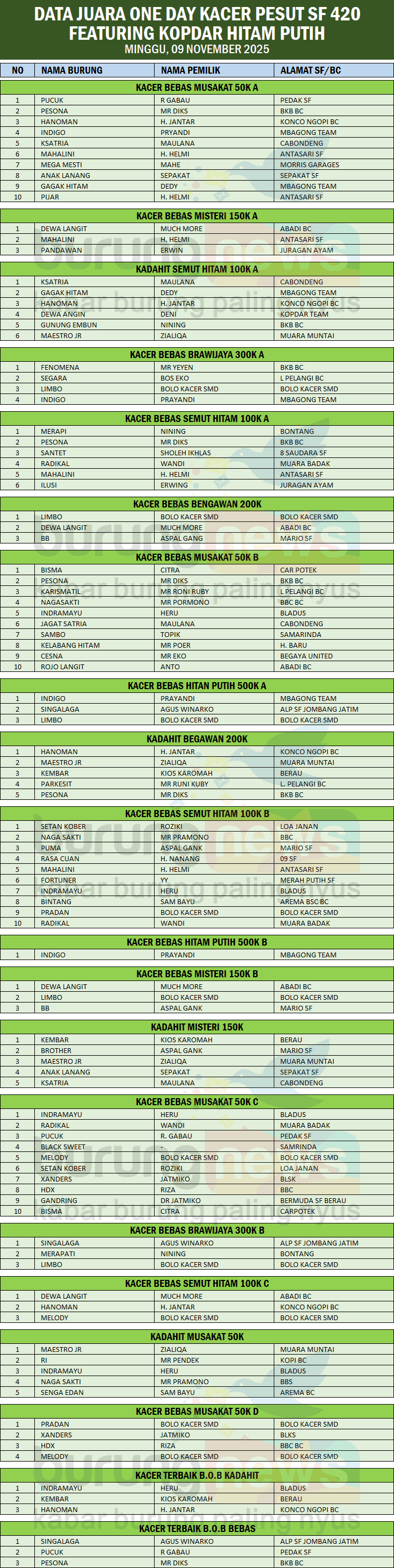 DATA JUARA ONE DAY KACER PESUT 420 FEATURING KOPDAR HITAM PUTIH – SAMARINDA, MINGGU, 9 NOVEMBER 2025