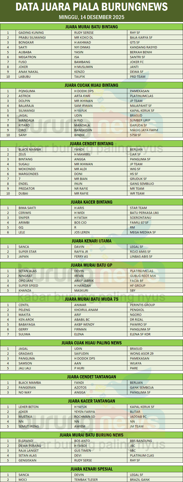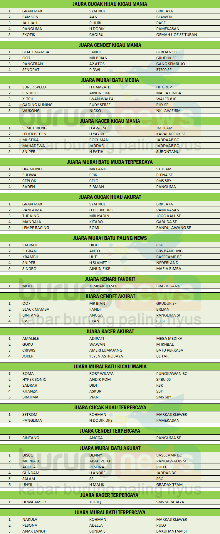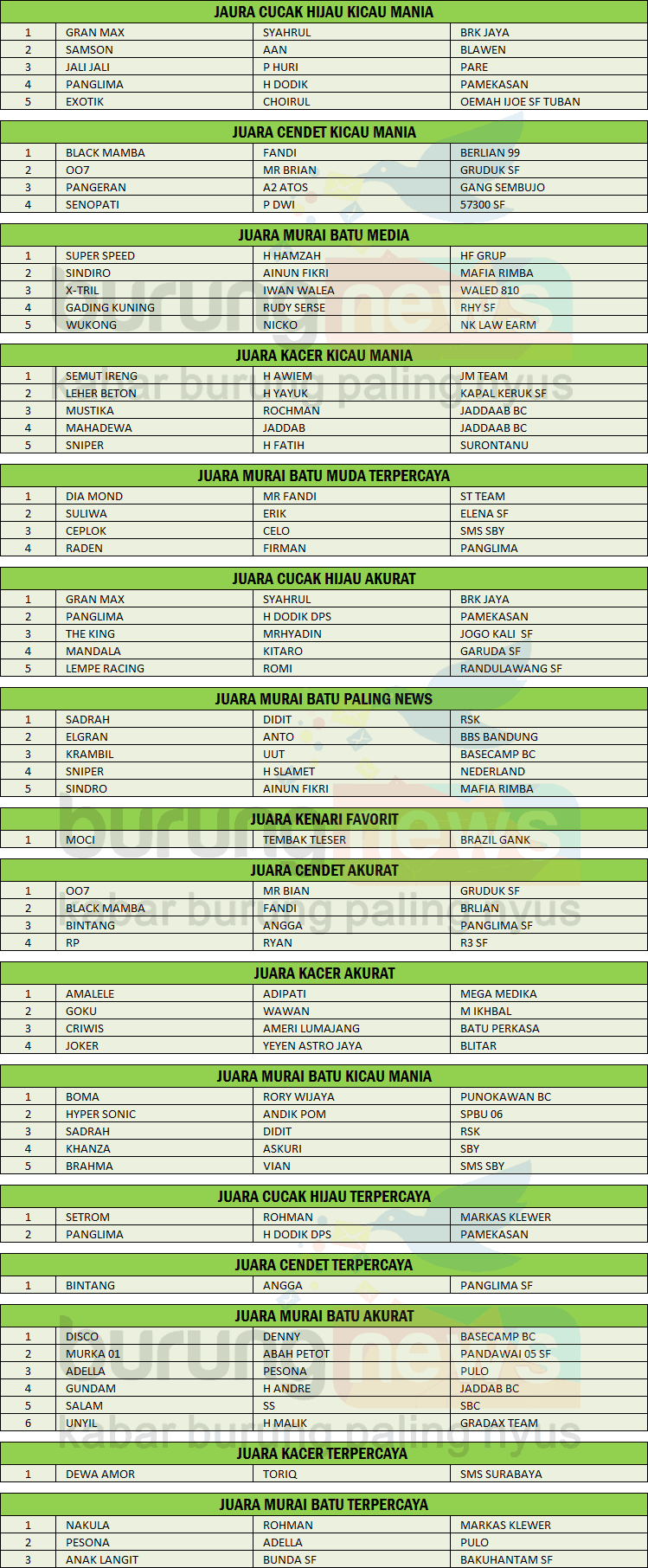 Gelaran prestisius akhir tahun, Piala Burungnews mengundang kesuksesan yang luar biasa. Ticketing sejak H-7 full, ludes terjual. Para pemain puas dengan penjurian dan doorprize yang diberikan oleh panitia gelaran. Kicau mania di blok jawa timur Tumplek blek jadi satu untuk mensukseskan gelaran ini.