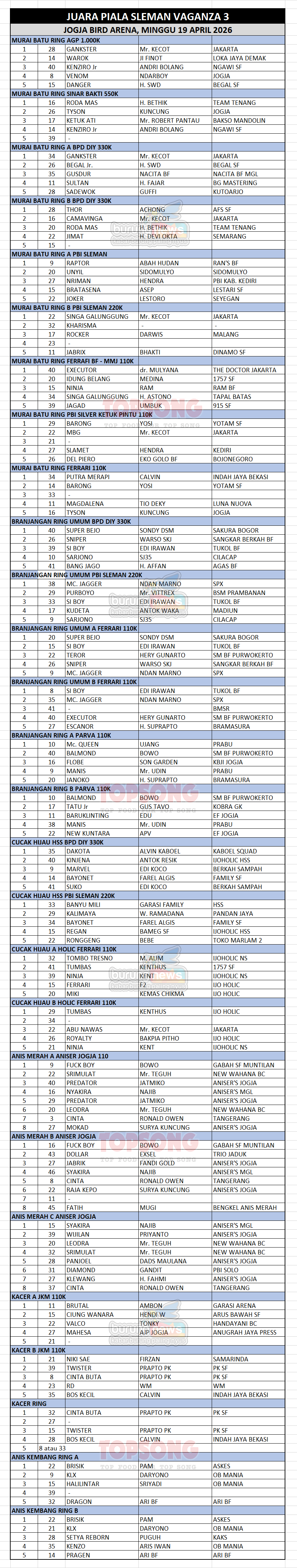 Empat (4) kelas Cucak Hijau dimenangkan oleh jago yang berbeda. Nama Dakota, Banyu Mili, Tombo Tresno, dan Tumbas, masing-masing berada di peringkat 1. Pada Anis Merah, Fuck Boy milik Bowo Gabah mendominasi kejuaraan dengan double winner. Satu kelas lain juara menjadi milik Syakira milik Gus Najib Magelang.