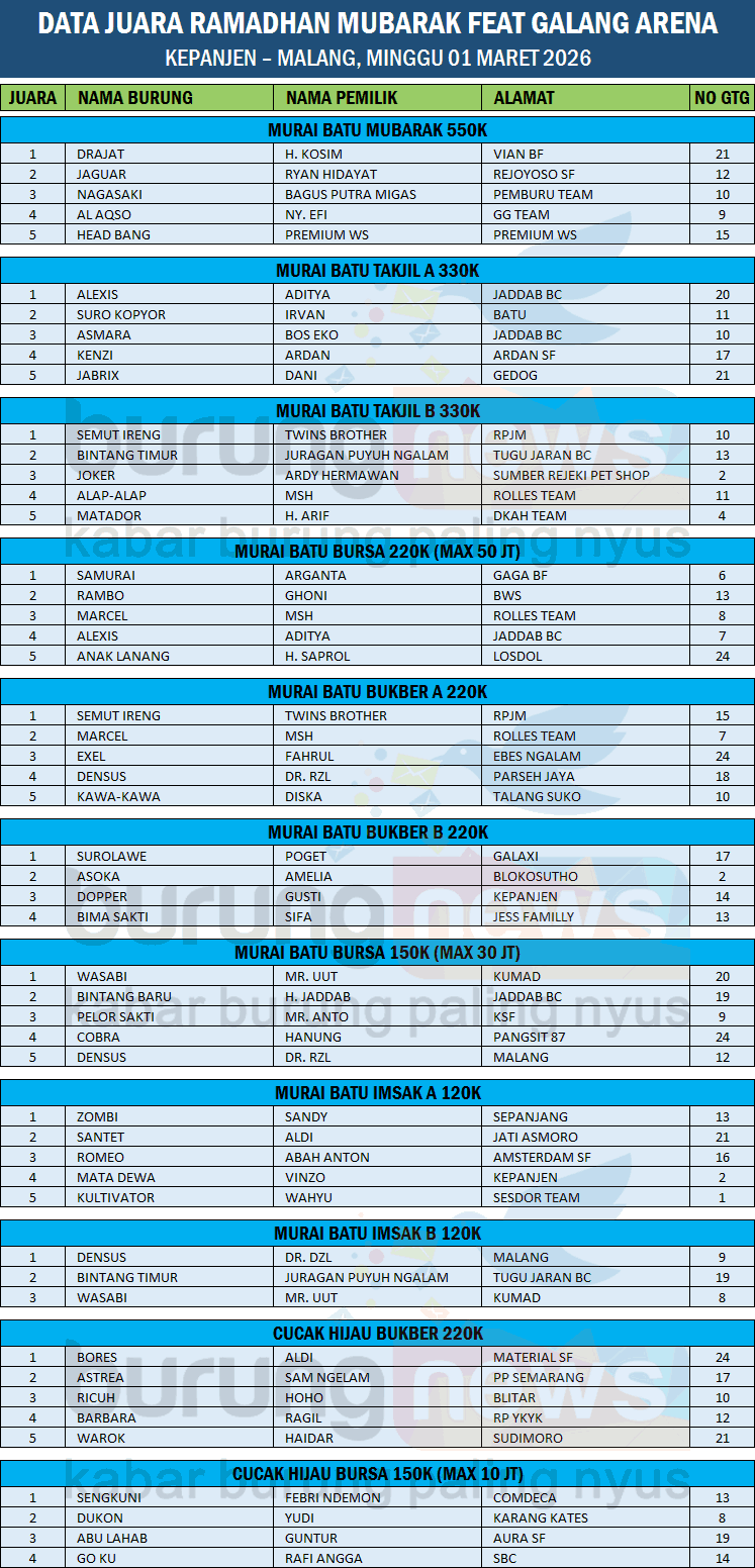 Event Ramadhan Mubarak (01 Maret 2026) di gantangan Galang Arena, Jl. Trunojoyo, Kepanjen, Kab. Malang berjalan sukses. Bahkan dikelas bursa terjadi deal dua kali, satu di murai dan satunya di cucak hijau.