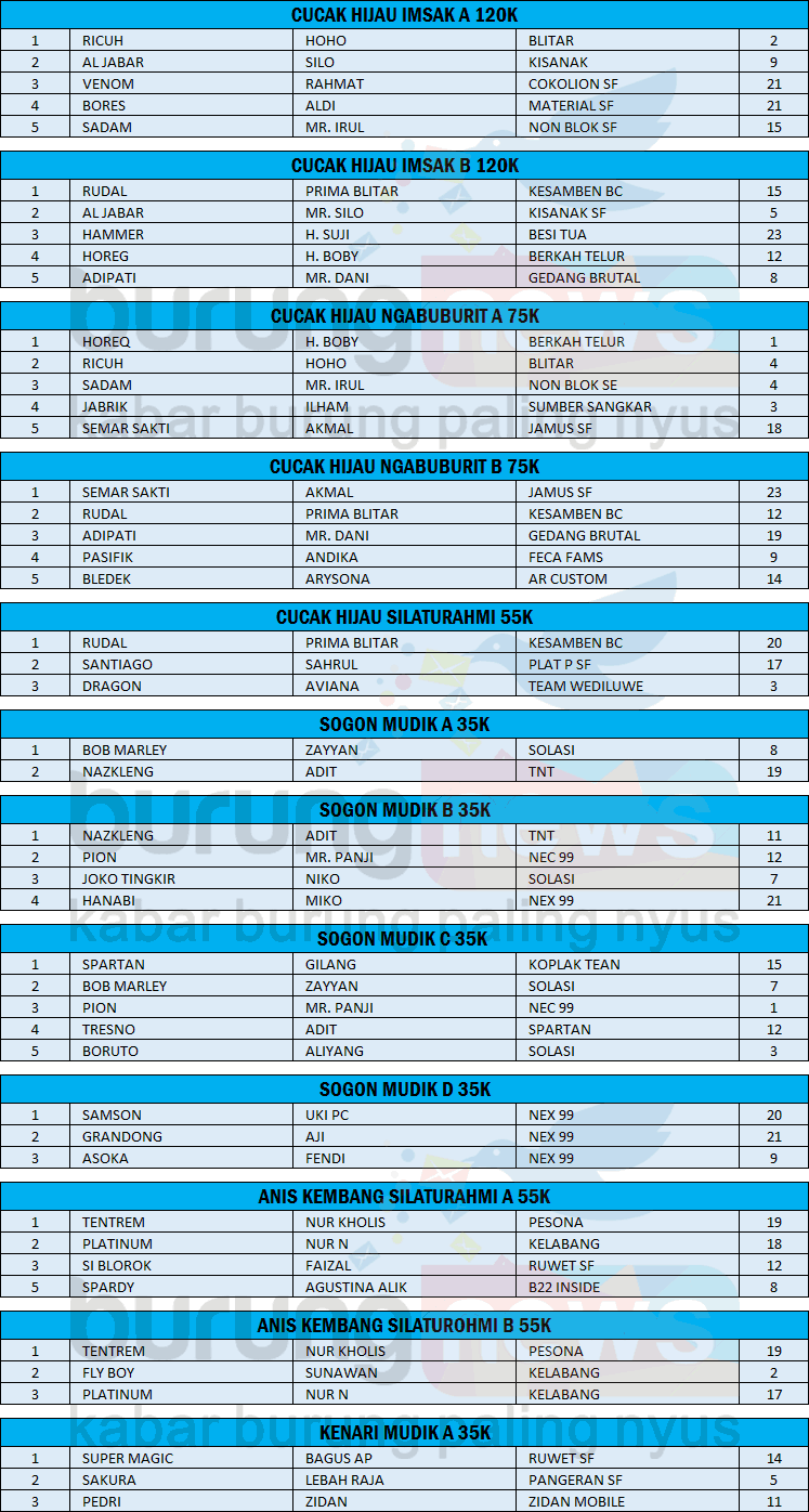 Secara keseluruhan, baik di kelas murai batu, cucak hijau, kenari, sogon dan anis kembang berlangsung seru, lancar dan kondusif.