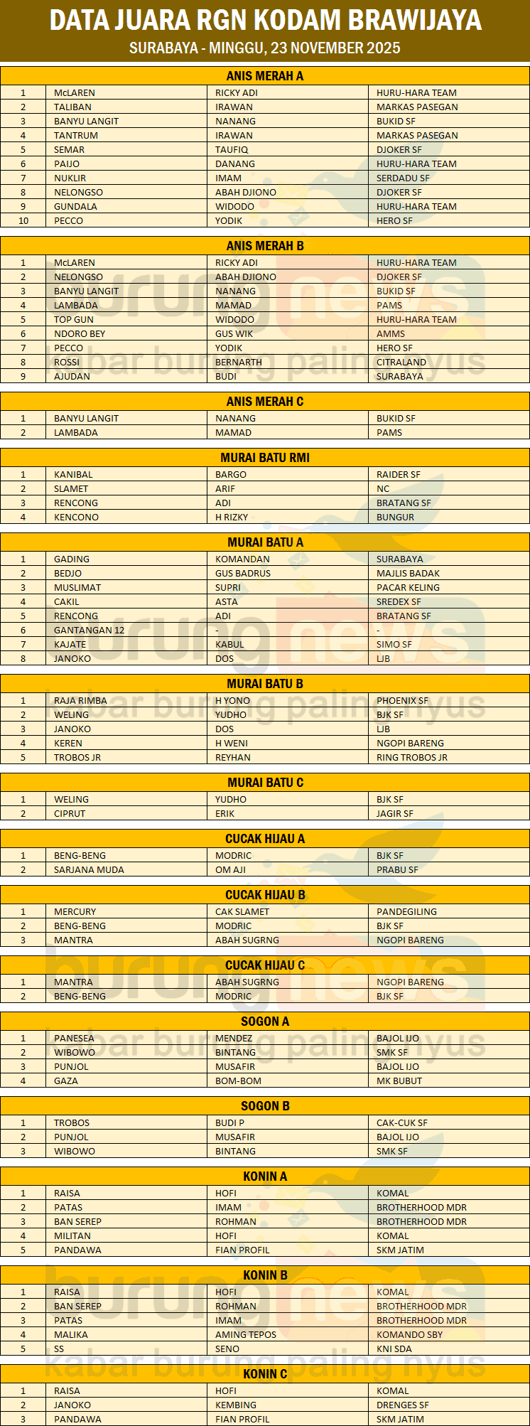 Konin Raisa milik Hofi dari Komal, mampu tampil gemilang untuk meraih hatrik atau tiga kemenangan pada latpres RGN Kodam Brawijaya – Surabaya hari Minggu, 23 November 2025. Sedangkan cucak hijau Beng-Beng milik Modric dari BJK SF, juga nyaris hatrik dengan meraih juara 1, 2 dan 2. Pada sesi anis merah McLaren milik Ricky Adi dari Huru-Hara Team, bisa menggondol dua kemenangan. [diks]