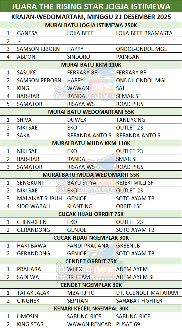 Jangan lupa event menarik Burungnews Award Feat KMN Reborn pada 25 Januari 2025 menyediakan hadiah banyak sepeda motor di Solo High Class, dilanjutkan event prestis tahunan bersama PBI yaitu Jogja Istimewa pada 15 Februari 2025. [busro]