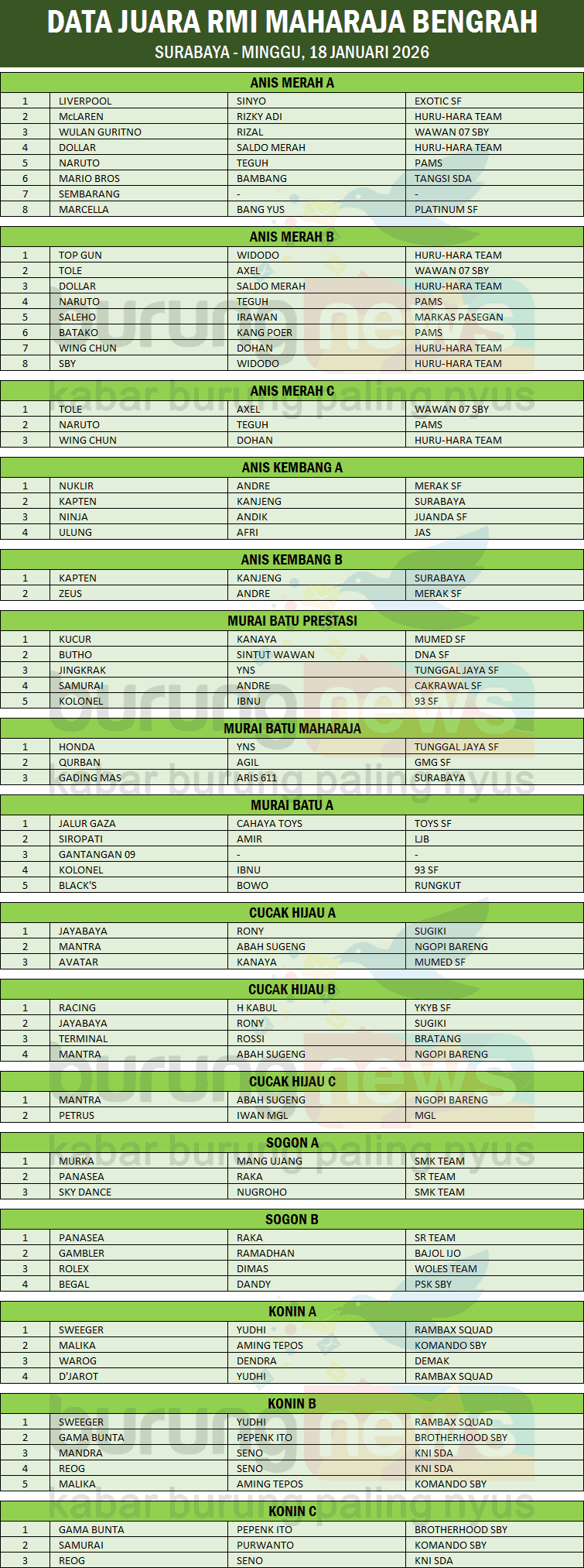 Konin Sweeger milik Yudhi dari Rambax Squad, bisa meraih dua kemenangan pada gelaran RMI Bengrah, Surabaya hari Minggu, 18 Januari 2026. Beberapa gaco lainnya seperti anis merah Tole milik Axel dari Wawan 07 Sby, anis kembang Kapten milik Kanjeng dari Surabaya, sogon Panasea milik Raka dari SR Team dan cucak hijau Jayabaya milik Rony dari Sugiki & Mantra milik Abah Sugeng dari Ngopi Bareng SF nyaris merebut dua gelar kejuaraan. [diks]