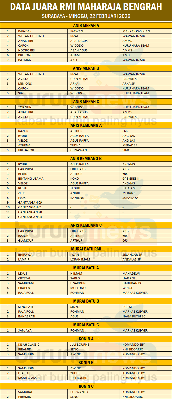 DATA JUARA RMI MAHARAJA BENGRAH - SURABAYA (MINGGU, 22 FEBRUARI 2026)
