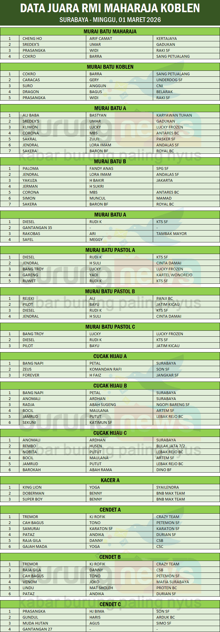 Murai batu pastol Diesel milik Rudi K dari KTS SF, nyaris meraih hatrik dengan menggondol juara 1, 1, 2 dan 3 pada gelaran RMI Maharaja Koblen - Surabaya hari Minggu, 01 Maret 2026. Sedangkan cucak hijau Bang Napi milik Petal dari Surabaya dan cendet Tremor milik Kj Rofik dari Crazy Team, mampu menyegel dua kemenangan. [diks]