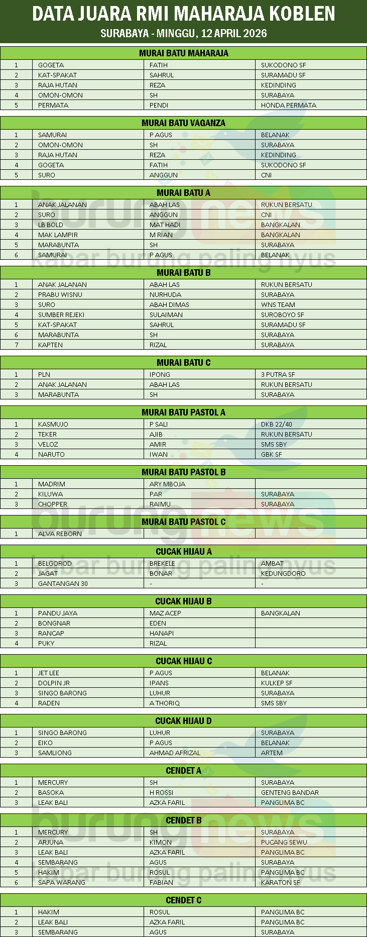 DATA JUARA RMI MAHARAJA KOBLEN - SURABAYA (MINGGU, 12 APRIL 2026)