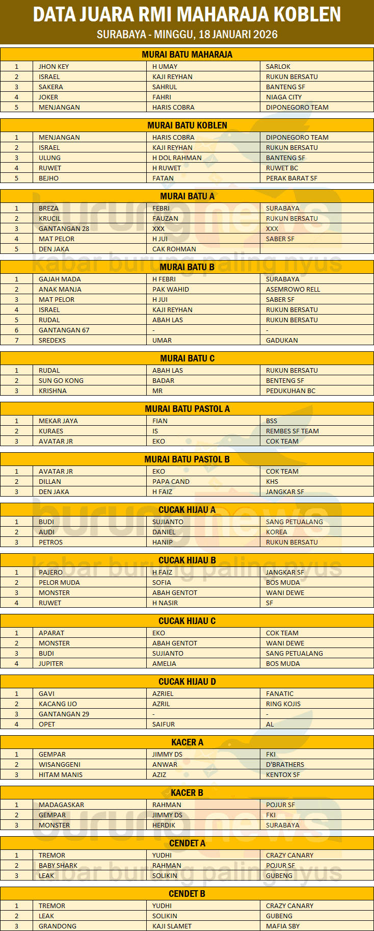 DATA JUARA RMI MAHARAJA KOBLEN - SURABAYA (MINGGU, 18 JANUARI 2026)