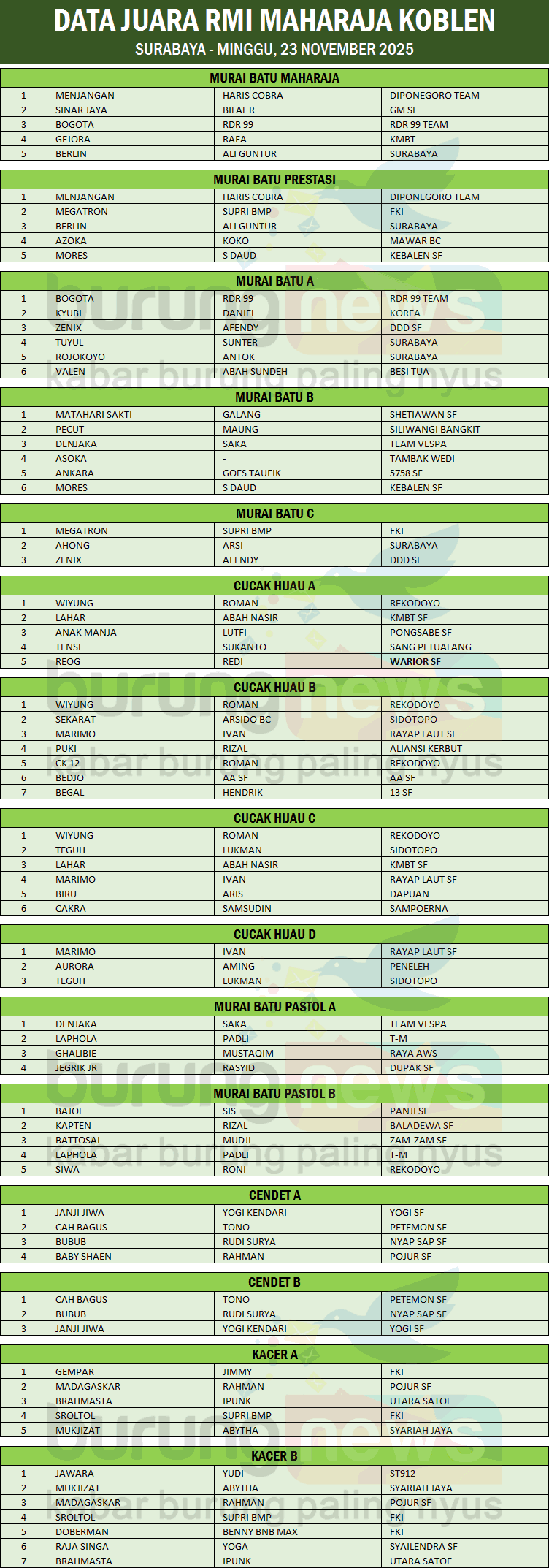Cucak hijau Wiyung milik Rohman dari Rekodoyo menjadi satu-satunya yang bisa meraih hatrik pada gelaran latpres RMI Maharaja Koblen – Surabaya hari Minggu, 23 Novembar 2025. Sedangkan murai batu Menjangan milik Haris Cobra dari Diponegoro Team, bisa merebut dua kemenangan. [diks]