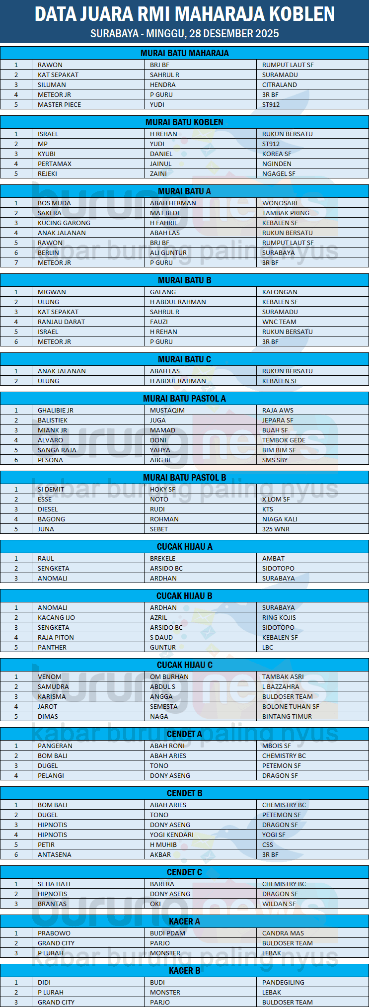 DATA JUARA RMI MAHARAJA KOBLEN - SURABAYA (MINGGU, 28 DESEMBER 2025)