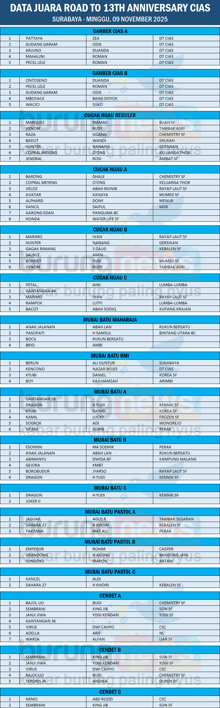 DATA JUARA ROAD TO 13TH ANNIVERSARY CIAS - SURABAYA (MINGGU, 09 NOVEMBER 2025)