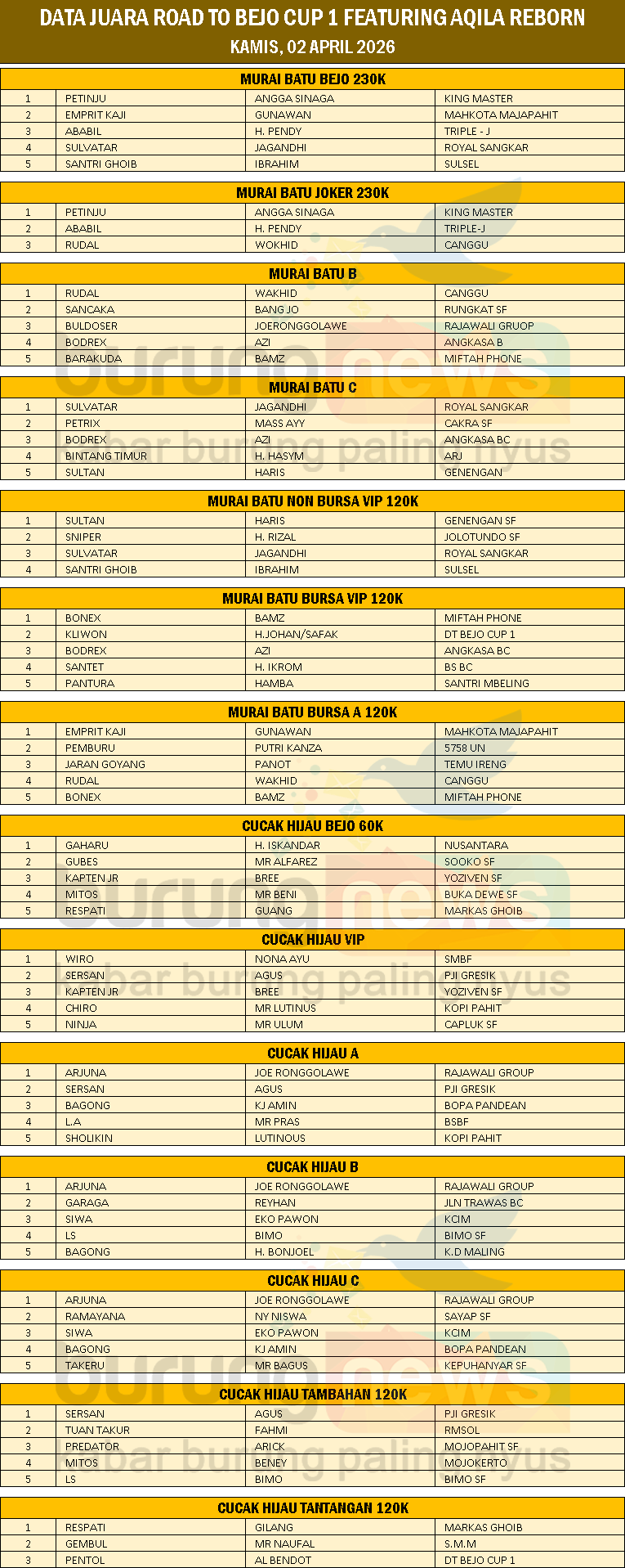 DATA JUARA ROAD TO BEJO CUP 1 FEATURING AQILA REBORN, KAMIS, 02 APRIL 2026