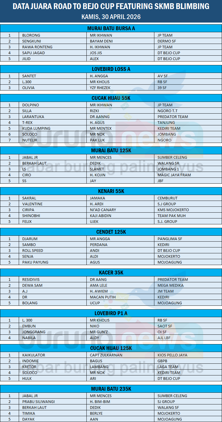 DATA JUARA ROAD TO BEJO CUP FEATURING SKMB BLIMBING, KAMIS, 30 APRIL 2026