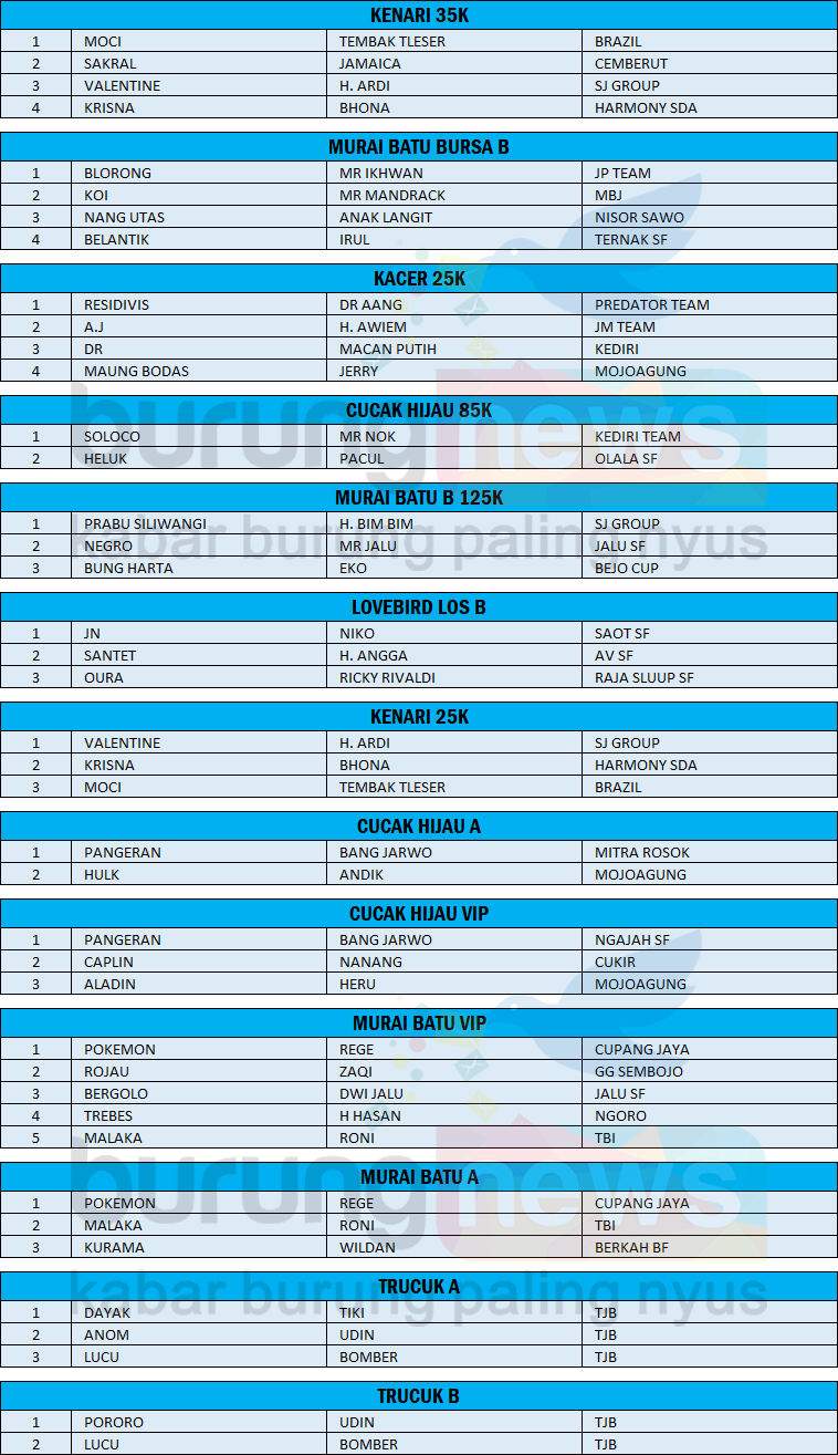 Pada sesi Murai batu, Jabal Jr milik Mr Mences dari Sumber Celeng SF nyeri atau juara 1 dua kali. Sementara itu, Djarum milik Mr Angga dari Panglima SF keluar sebagai juara di sesi cendet A. [Wawa]