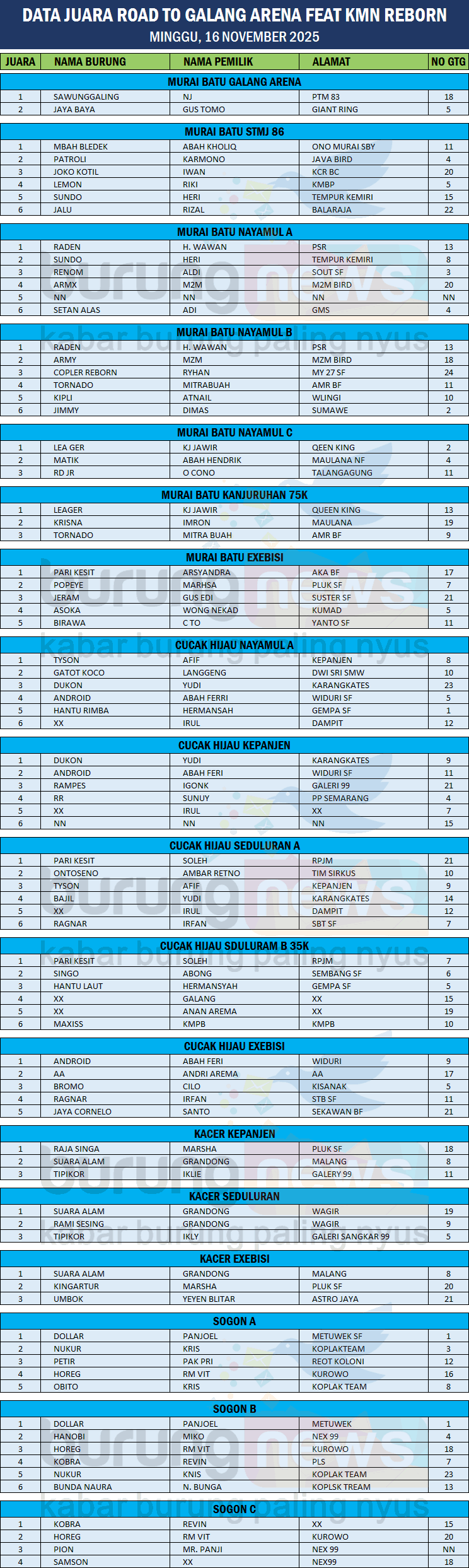 Road To Galang Arena feat KMN Reborn yang digelar Minggu 16 November 2025 berjalan seru dan lancar. Seperti biasa untuk murai dan cucak hijau rata-rata full gantanga. Untuk penjeda ada kelas kacer dan sogon yang dihelat sampai tiga sesi.