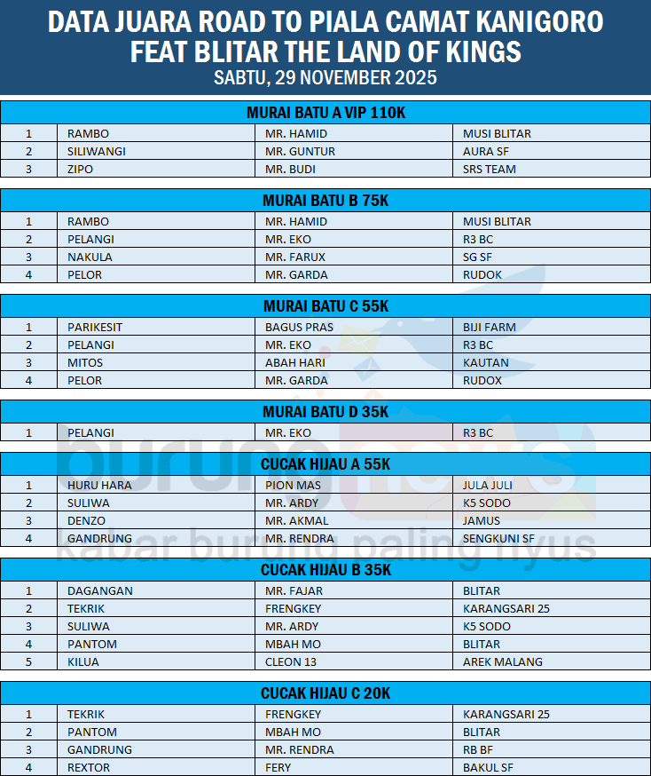 Secara keseluruhan, jalannya lomba lancar, ramai, seru dan kondusif. “Hari ini sangat istimewa kicau mania Blitar Raya. Kita menuju Piala Camat Kanigoro, 14 Desember 2025,” kata Mr. Bylod, ketua penyelenggara lomba.