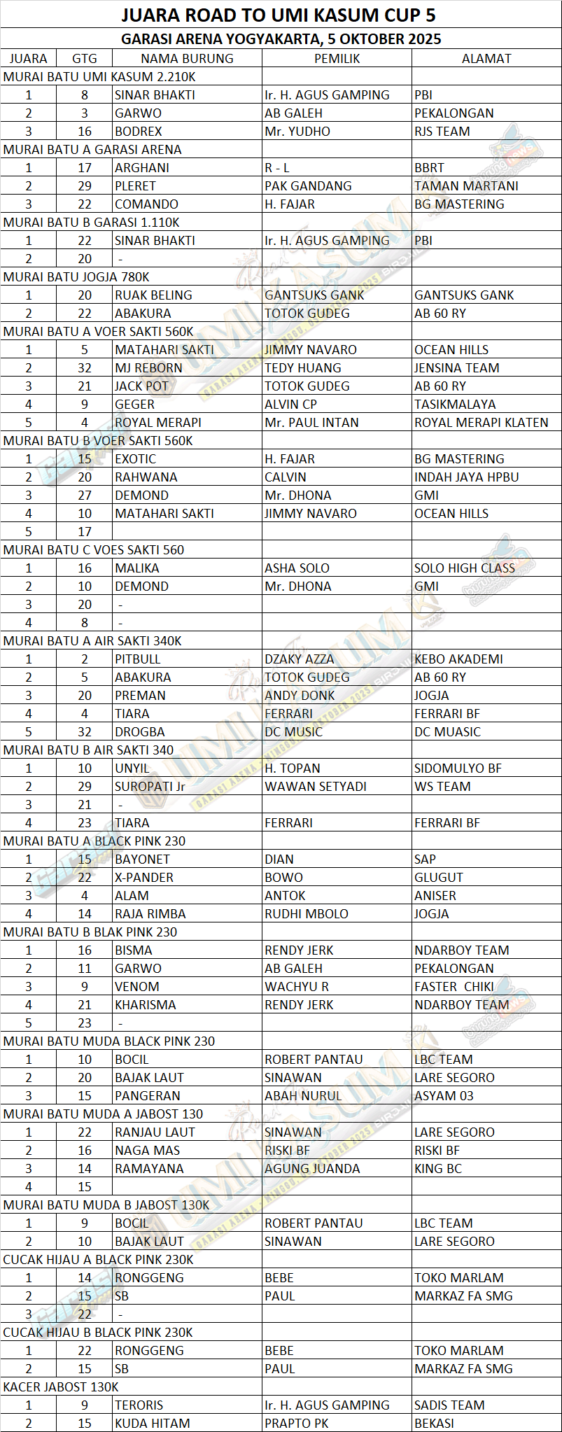DATA JUARA ROAD TO UMI KASUM CUP 5