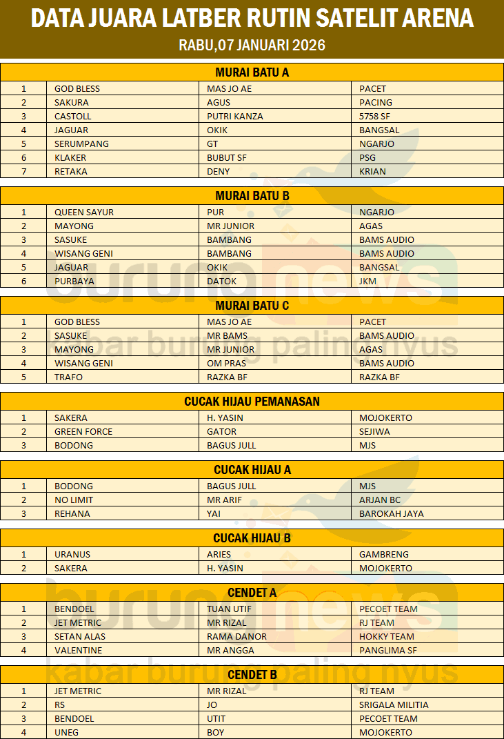 DATA JUARA SATELIT ARENA MOJOKERTO, RABU, 07 JANUARI 2026