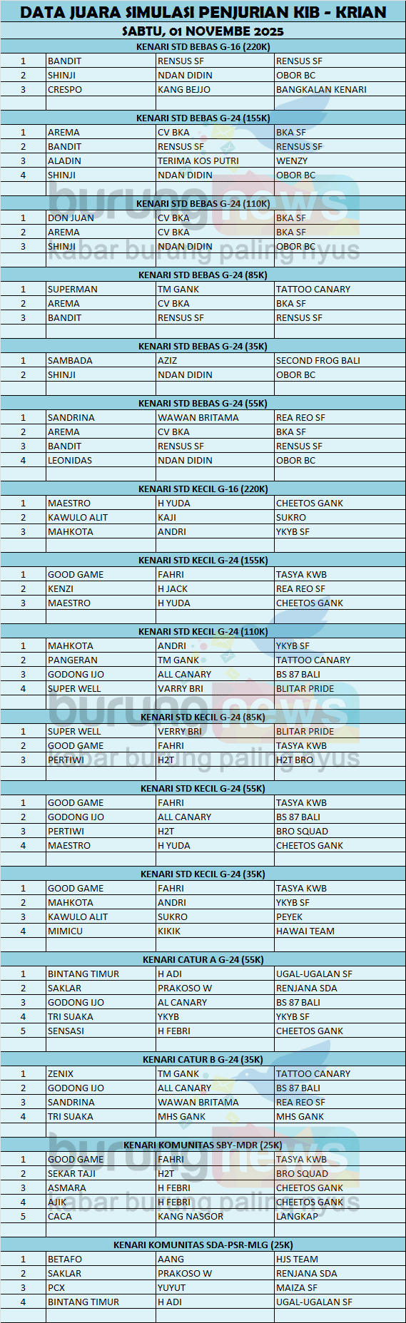 Good Game burung milik Fahri dari KWB menjadi bintang pada Simulasi Penjurian KIB ke tiga pada hari Sabtu, 01 November 2025. Empat gelar juara pertama dan sekali runner-up berhasil diraihnya pada gelaran yang melombakan 16 kelas khusus untuk kenari ini.