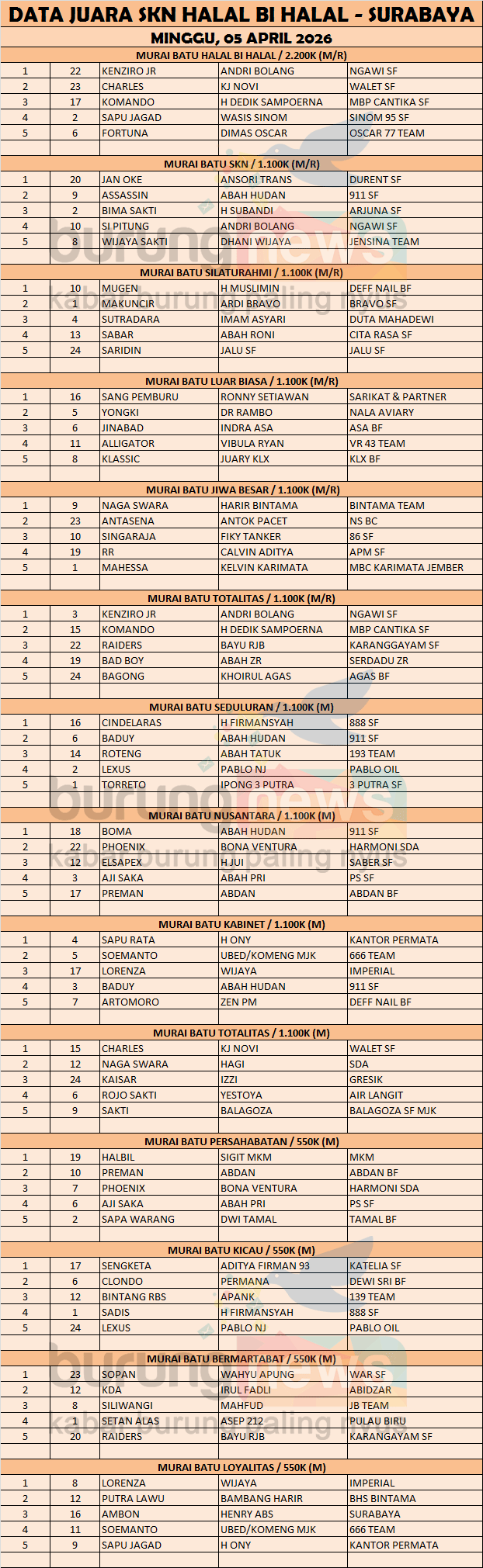 Kenziro Jr gaco andalan Andri Bolang mampu meraih dua gelar juara pertama pada SKN Halal Bi Halal yang berlangsung di gantangan Bengrah Surabaya hari Minggu, 05 April 2026. Sedangkan Charles milik Kaji Novi meraih double winner.