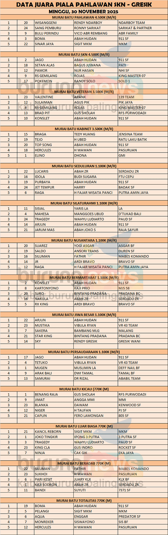 Wisanggeni milik Rendy Ndarboy dan Jago milik Abah Hudan sukses membawa pulang hadiah utama mobil pada event SKN-Piala Pahlawan yang berlangsung di Bumi Perkemahan Semen Gresik, Minggu 30 November 2025.
