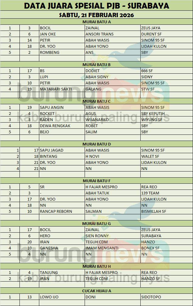 Bocil milik Zainal dari Zeus Jaya berhasil meraih hasil nyeri juara pertama di Spesial PJB hari Sabtu, 21 Februari 2026 di gantangan Bengrah Surabaya. Banyak sekali kicaumania yang tertarik untuk meminang Bocil tapi sayangnya masih belum cocok.
