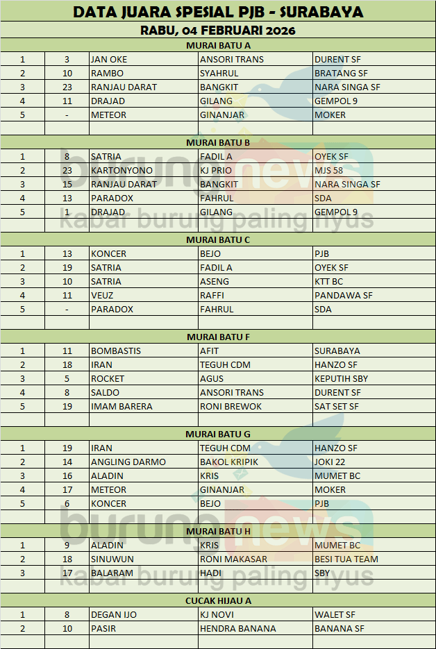 Jan Oke kembali memperlihatkan kestabilannya di jalur juara dan kali ini tampil satu kali langsung menyabet juara pertama kelas utama di Spesial PJB hari Rabu, 04 Februari 2026 di gantangan Bengrah Surabaya.