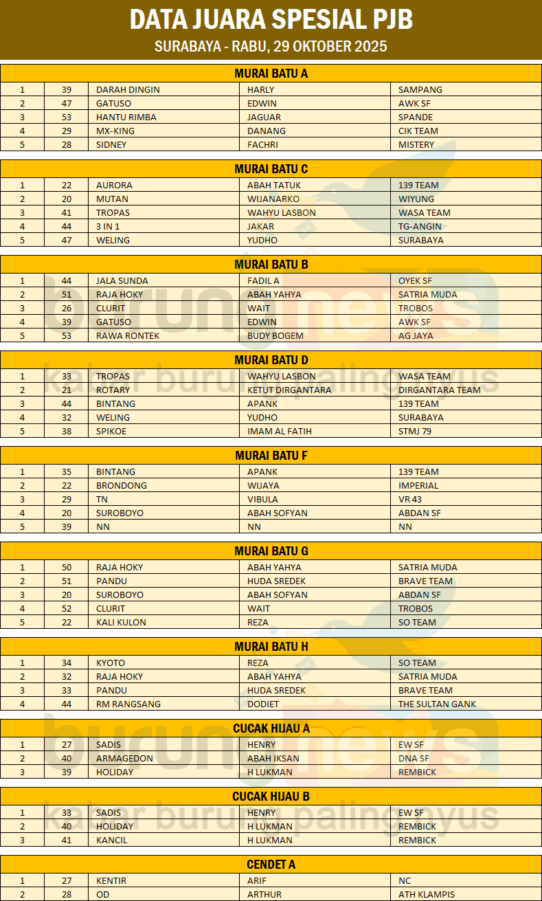Gelaran perdana spesial PJB di gantangan Bengrah, Sawunggaling - Surabaya, hari Rabu, 29 Oktober 2025. Menghadirkan murai batu Raja Hoky milik Abah Yahya nyaris meraih hatrik, sedangkan cucak hijau Sadis milik Henry mampu meraih dua kemenangan.
