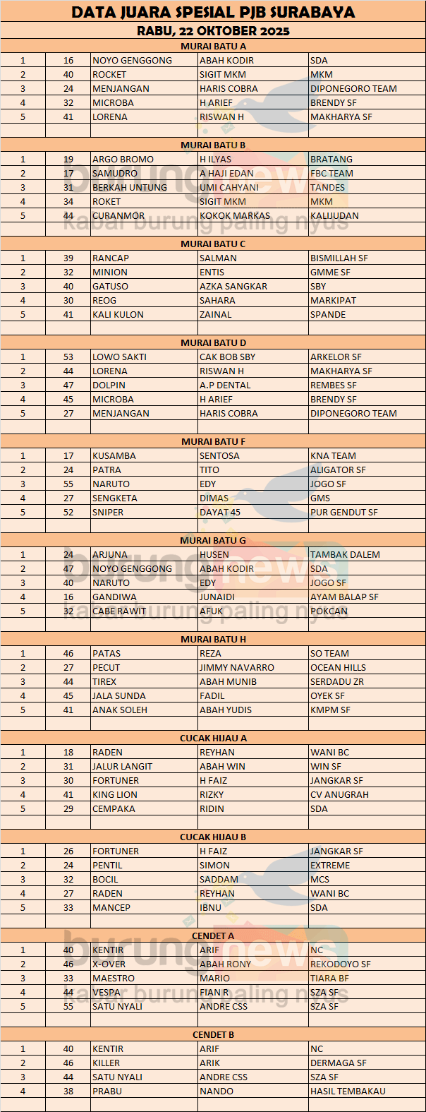 Noyo Genggong milik Abah Kodir dari Sidoarjo mampu tampil stabil dengan merebut juara pertama dan kedua pada special PJB hari Rabu, 22 Oktober 2025 di gantangan Kodam V Brawijaya Surabaya. Pecut gaco Jimmy Navarro mampu tampil istimewa pada sesi murai batu G.
