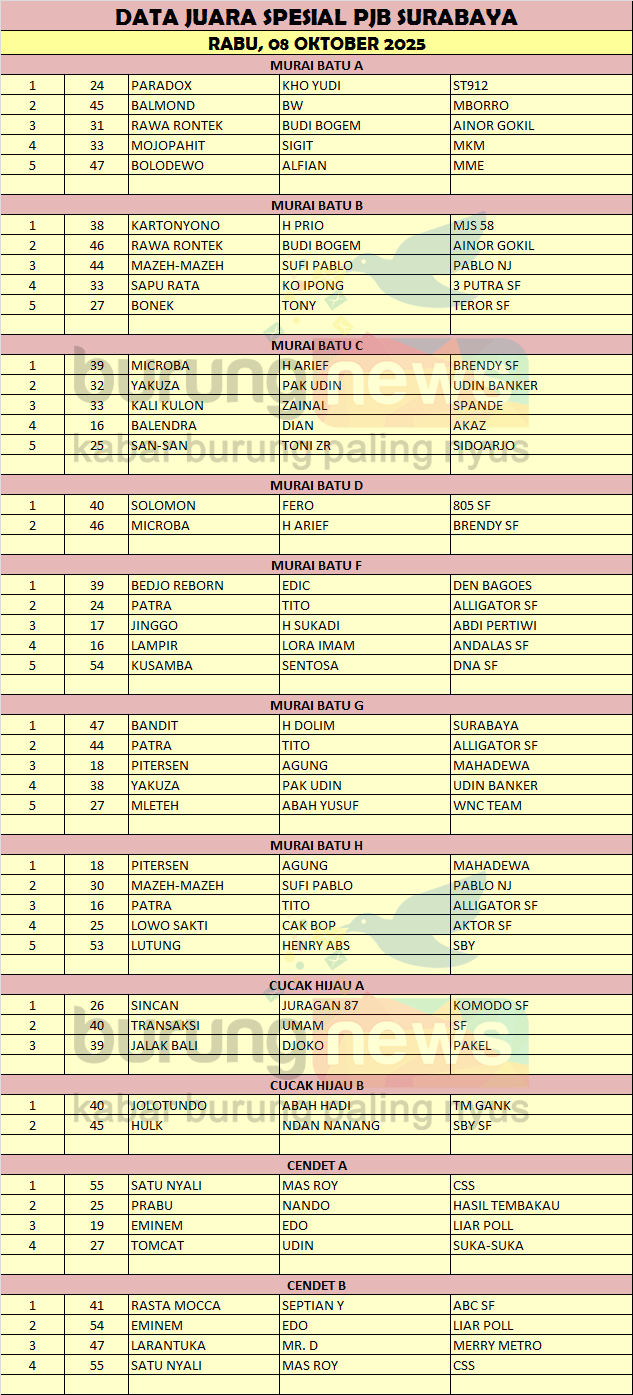 Paradox burung andalan Yudi ST912 berhasil menjadi yang terbaik di kelas utama murai batu pada gelaran rutin Spesial PJB hari Rabu, 08 Oktober 2025 di Gantangan Kodam V Brawijaya Surabaya. Sementara Kartonyono mampu stabil juara satu di PJB.