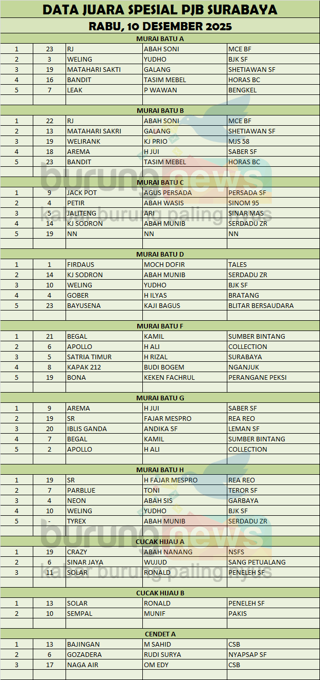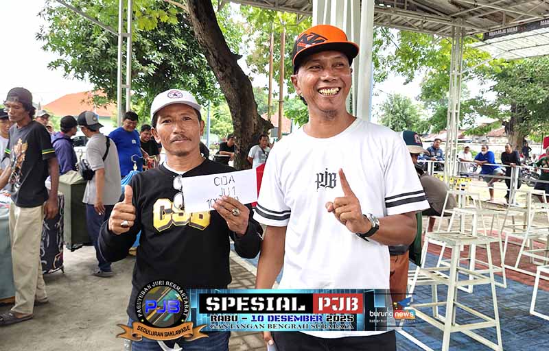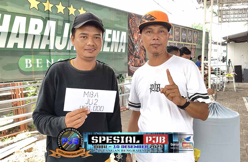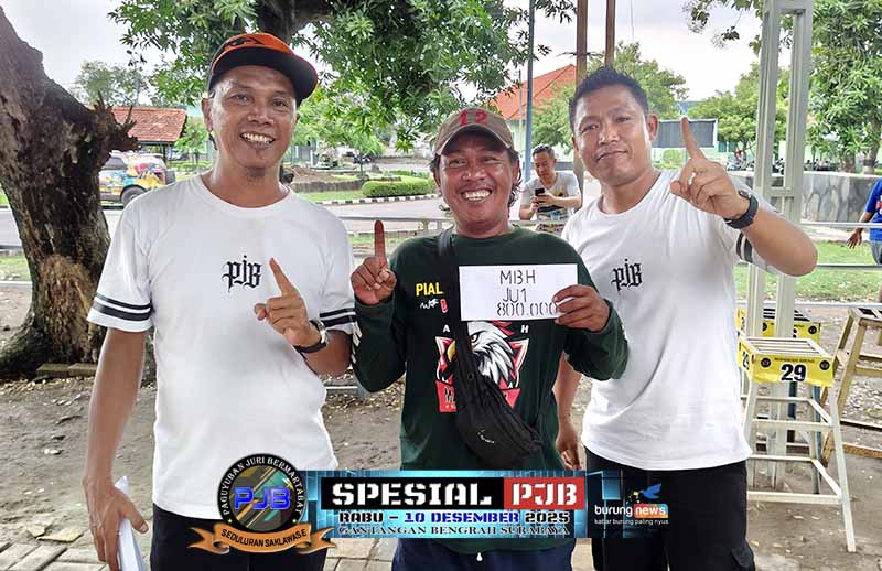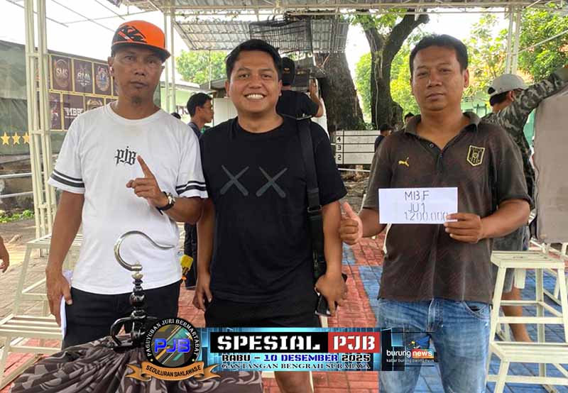 RJ gaco Abah Soni dari MCE BF sukses merebut dua gelar juara alias nyeri juara pertama di kelas murai batu A dan B pada Spesial PJB hari Rabu, 10 Desember 2025 di gantangan Maharaja Bengrah Surabaya. SR milik H Fajar Mespro meraih hasil double winner.