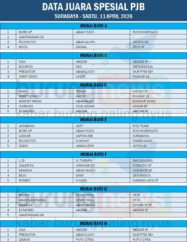 DATA JUARA SPESIAL PJB - SURABAYA (SABTU, 11 APRIL 2026)