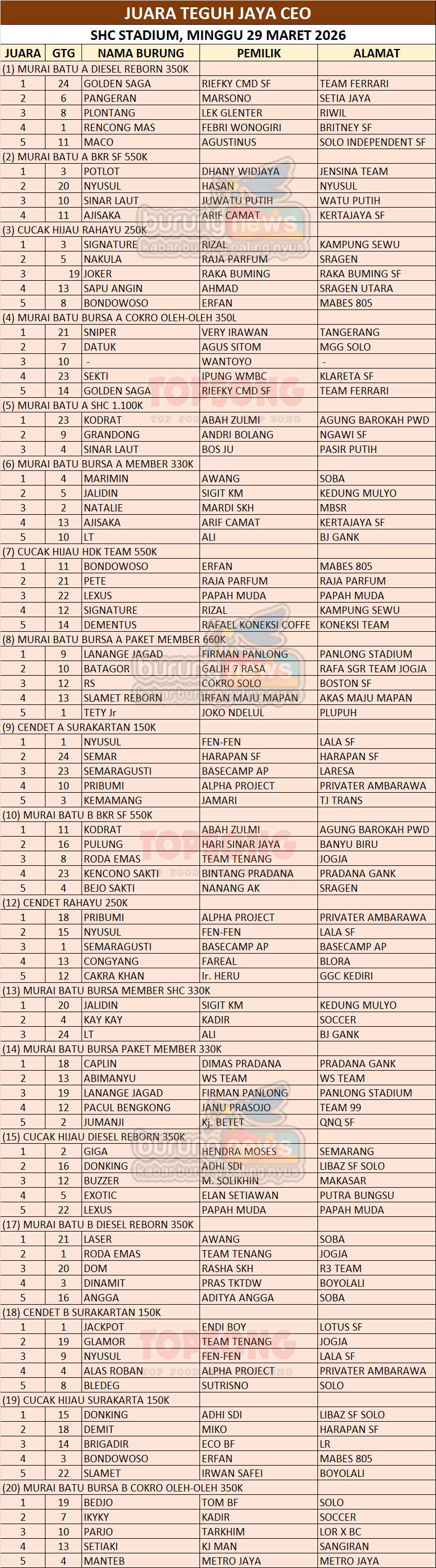 “Selain dari Jawa Tengah, dari Jawa Timur juga banyak yang datang ke sini, jadi merasa tertantang. Bersyukur Pribumi bisa mencuri juara 1, jadi bangga dan puas sekali. Siap hadir lagi ke SHC kalau ada even lagi yang lebih besar dan buka kelas Cendet.”