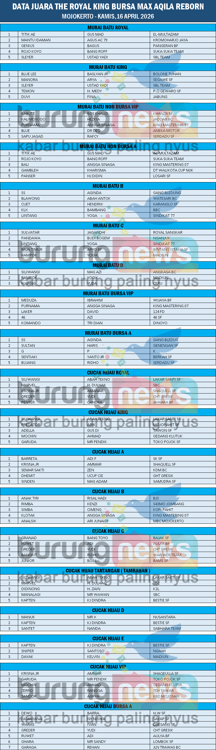 DATA JUARA THE ROYAL KING BURSA MAX AQILA REBORN MOJOKERTO, KAMIS, 16 APRIL 2026