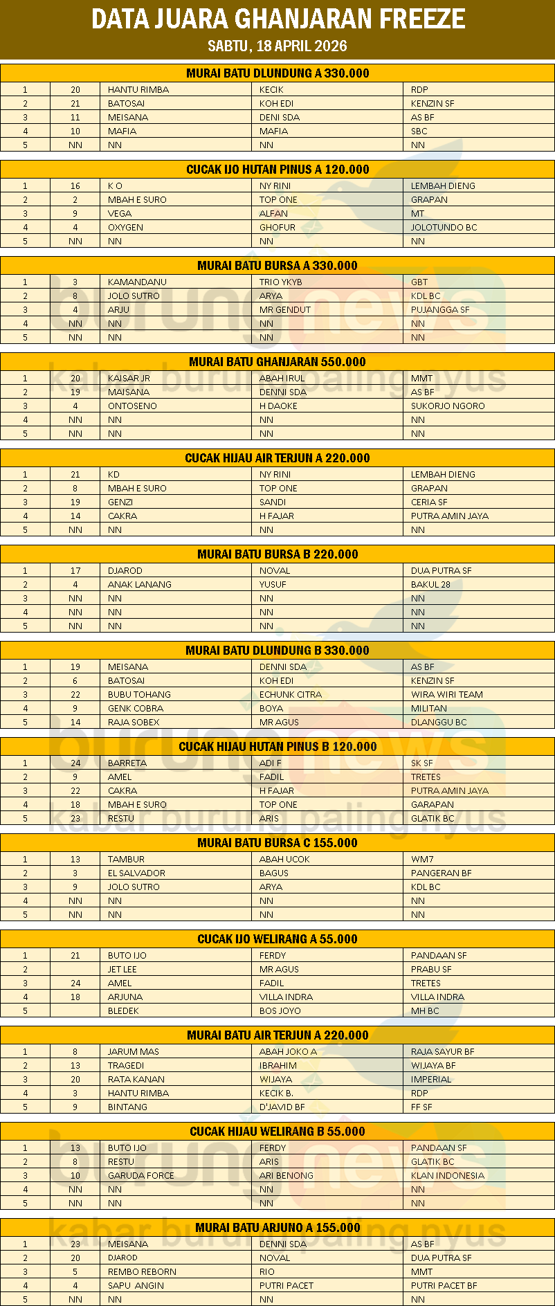 DATA JUARA UJI PRESTASI GHANJARAN STADIUM, SABTU, 18 APRIL 2026