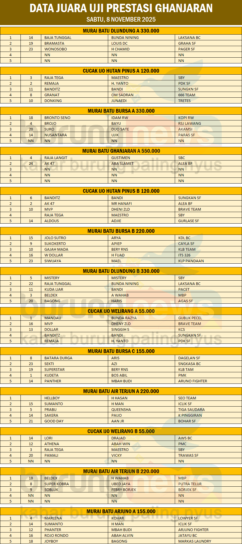 Lomba burung bertajuk Uji Prestasi di Ghanjaran Stadium, Sabtu, 8 November 2025 berjalan lancar dan sukses. Kelas cucak hijau peserta full dari awal hingga akhir. Sedang di kelas murai batu, hanya ada kekurangan peserta di sesi utama tiket 550K.