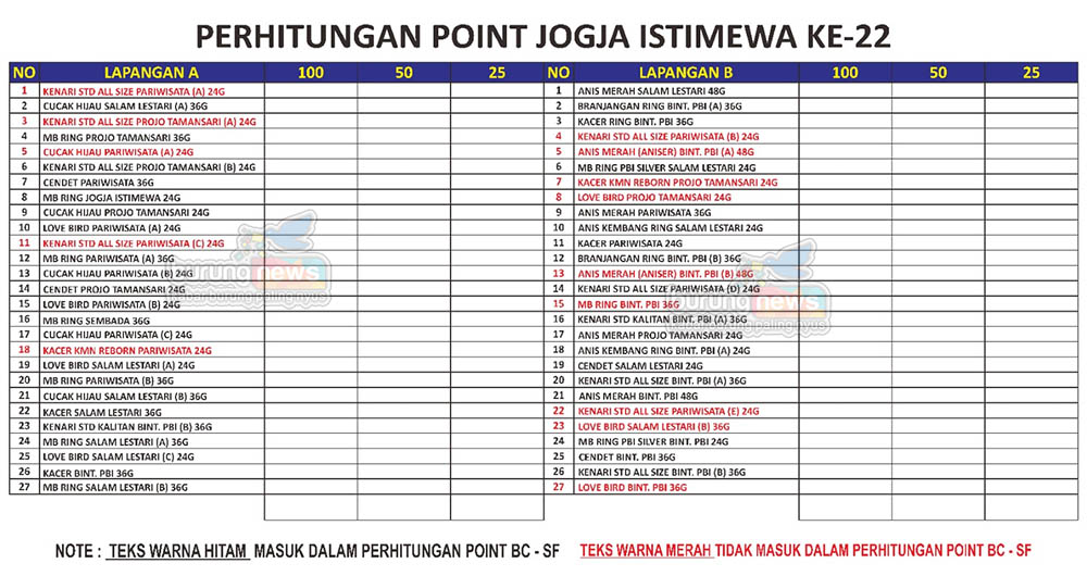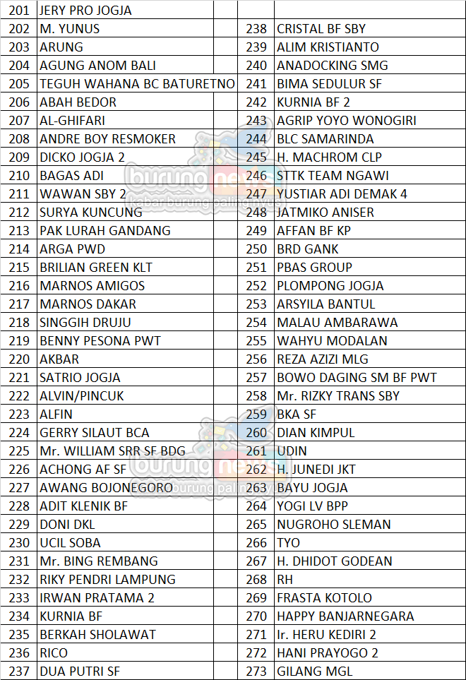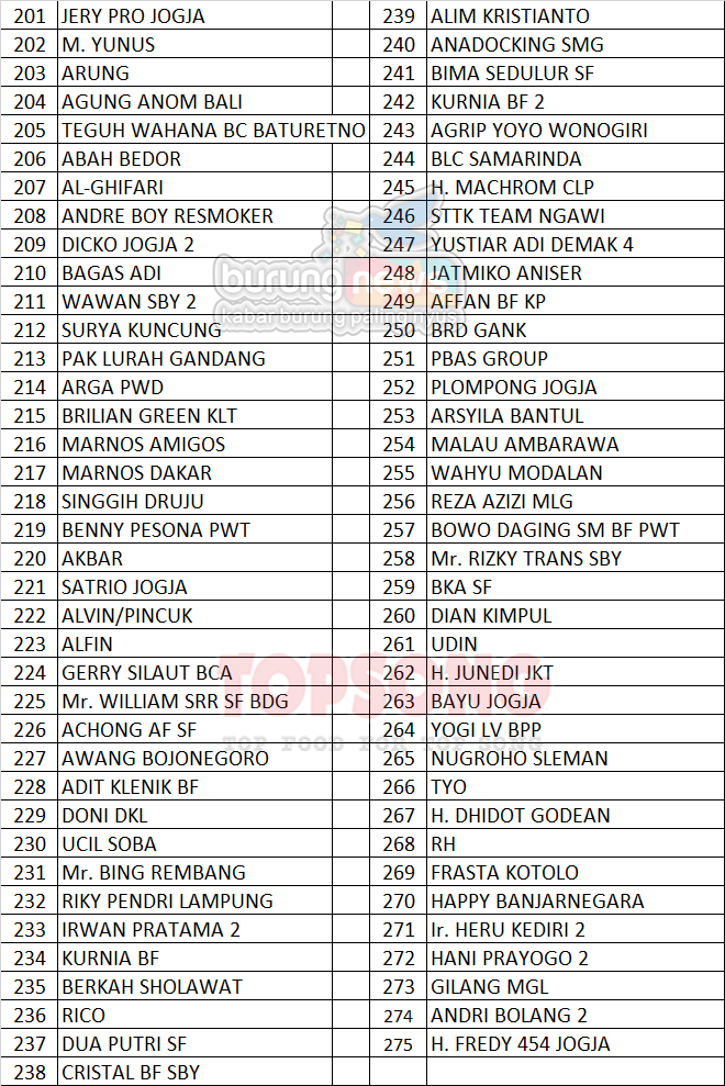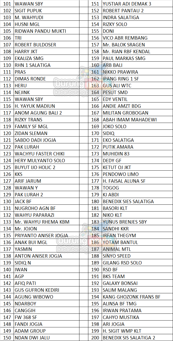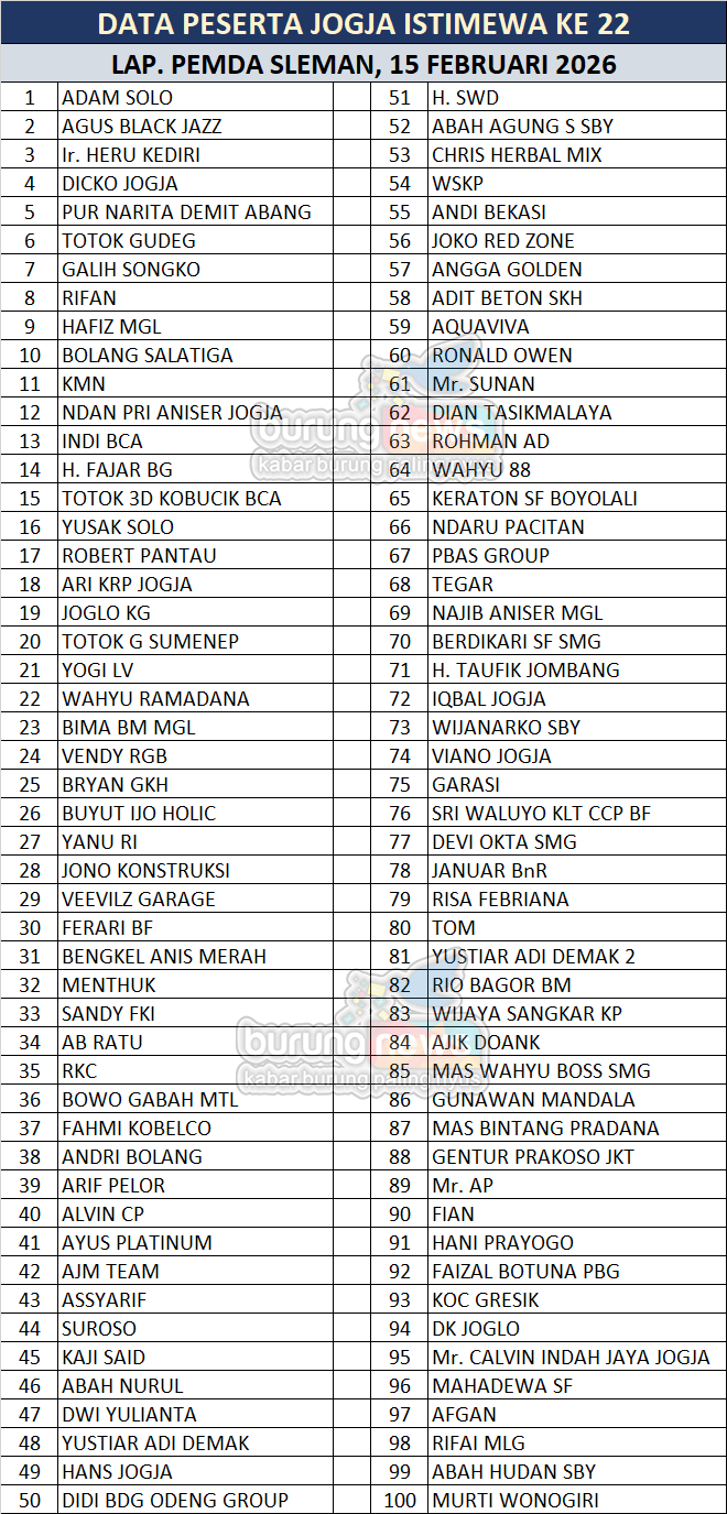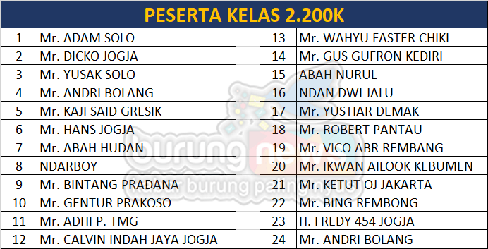 Sebagian besar kelas benar-benar sudah penuh alias sold out. Namun, ada beberapa kelas / jenis burung yang hingga data nama peserta ini dirilis, masih tersedia stok meskipun jumlahnya tidak banyak. Bagi yang membutuhkan, harap datang lebih awal pada saat pengambilan kupn pada hari Sabtu sore (14/2) di lokasi lomba, atau pada hari Minggu 15 Februari, silakan datang lebih awal. Panitia akan melayani pembelian langsung selama persediaan masih ada.