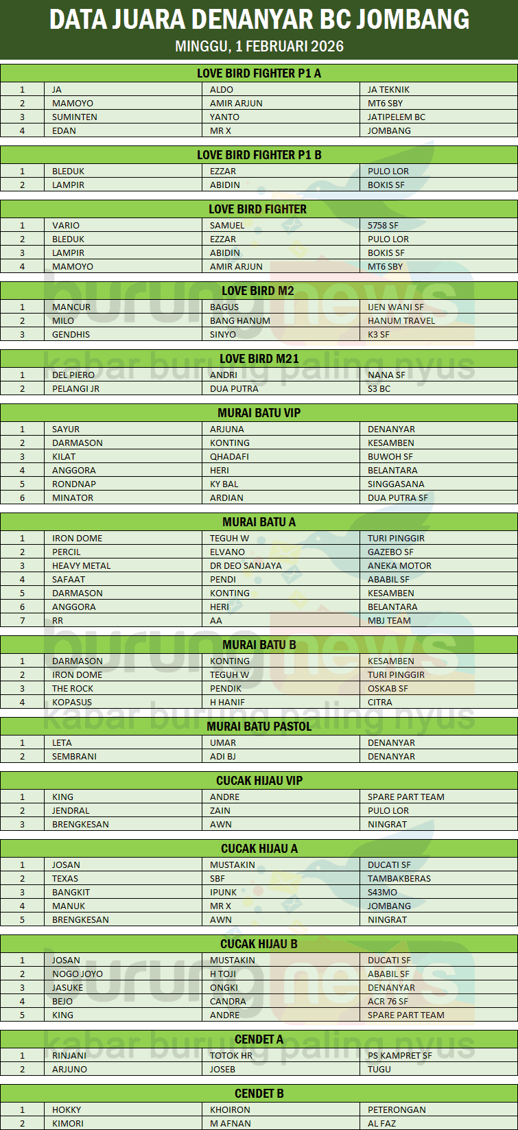 Diguyur hujan sejak pagi hingga lomba usai, gelaran Denanyar BC di Lapangan Pasar Desa Denanyar, Jombang, Minggu 1 Februari 2026 justru berjalan makin panas. Bukan cuma kondusif, antusiasme pemain malah bikin geleng-geleng kepala. Khusus kelas Murai Batu dan Love Bird, tiket nyaris ludes tanpa sisa.
