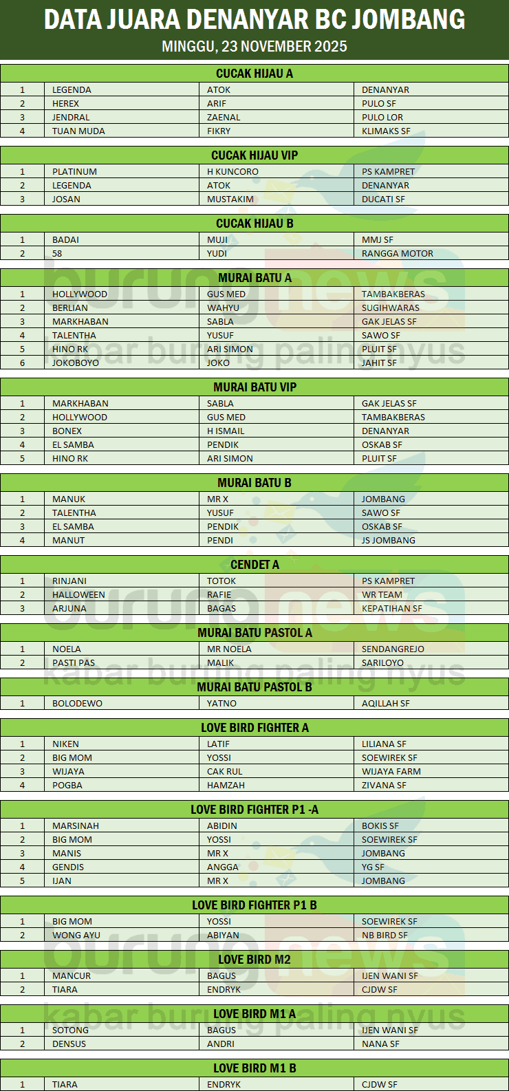 Para pemain love bird makin betah main di Gantangan Denanyar BC karena kelas yang dibuka makin variatif, sehingga pemain bisa pilih kelas sesuai spek gaco. Di kelas Murai Batu, kuota G-35 dipenuhi pemain.