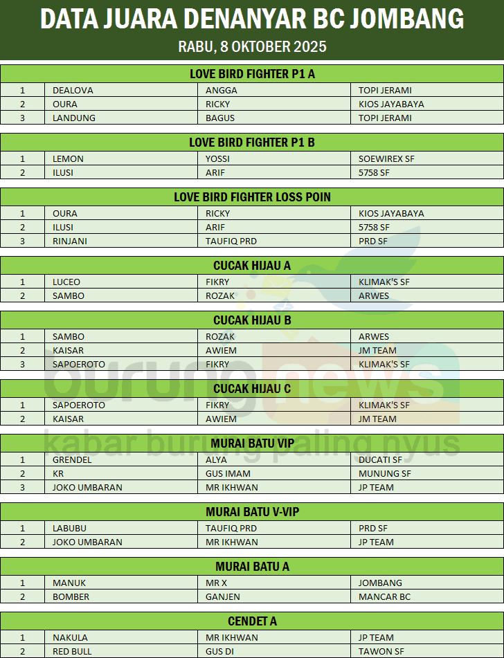 Bisa dibilang, Dealova dan Oura sukses jadi dua bintang paling terang di langit Denanyar BC hari ini. Satu menang taktik, satu menang durasi — dua-duanya bukti bahwa di dunia love bird, bukan cuma durasi yang penting, tapi juga feeling dan timing saat nentuin gaya main.