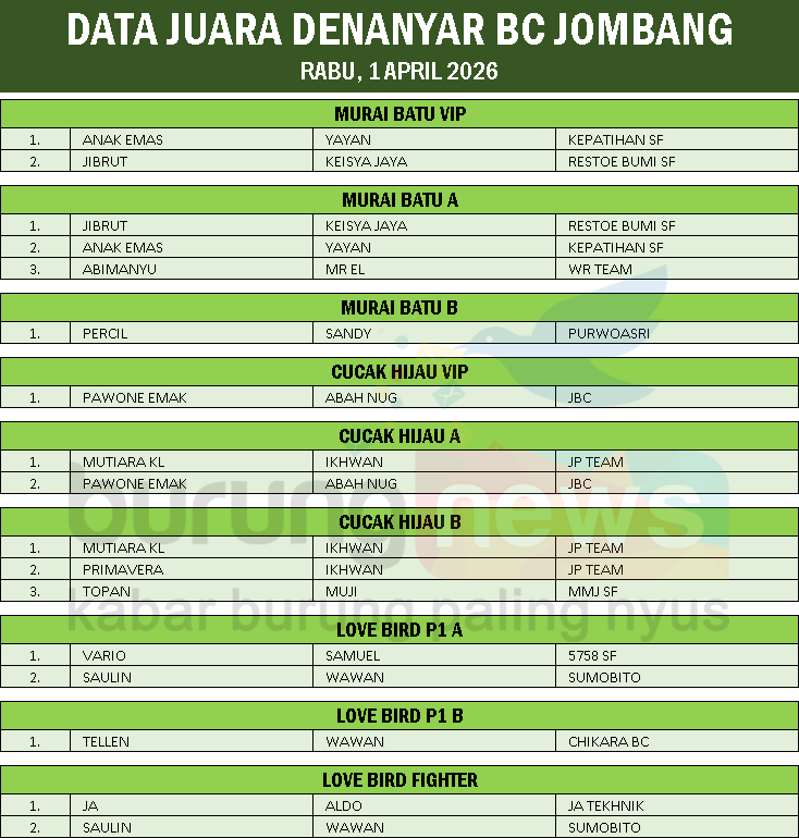 Secara keseluruhan, latber Denanyar BC hari ini berlangsung kondusif. Cuaca panas gak ngaruh, justru bikin adrenalin makin naik. Gaco-gaco top saling unjuk gigi, drama ada, aksi juga full. Dari Murai Batu sampai Love Bird, semuanya kasih tontonan yang gak cuma seru tapi juga berkualitas.(juned/wawa)