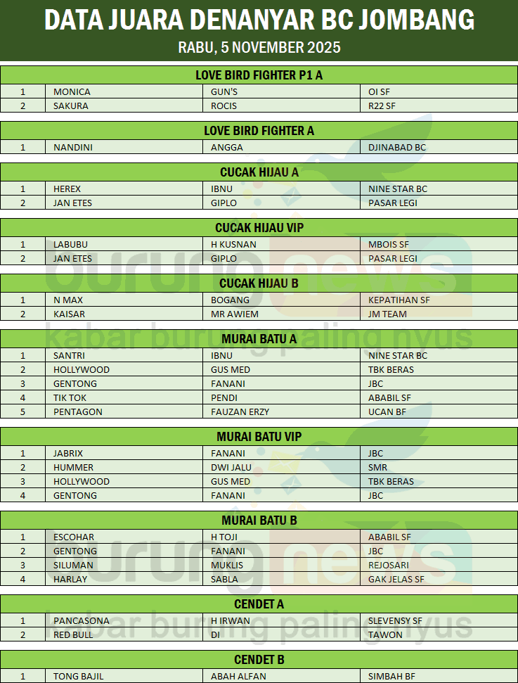 Gantungkan cita-cita setinggi langit bro! Moto ini juga jadi pegangan H. Toji dari Ababil SF, pemilik gaco Escohar yang berhasil moncer di kelas murai Batu B di gelaran Denanyar BC di Lapangan Pasar Desa Denanyar Jombang pada Rabu 5 November 2025.