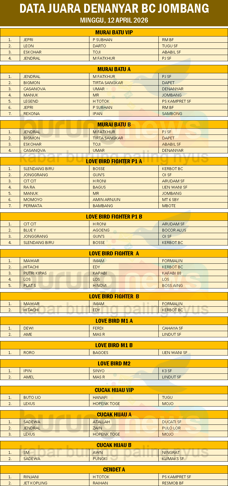 Seperti Minggu, 12 April 2026 ini nih. Di saat Gus Dur Cup lagi digelar di Kebokicak BC, Denanyar BC yang cuma buka latber rutin justru kebanjiran peserta, khususnya di kelas Murai Batu sama Love Bird. Bener-bener nggak masuk akal ramainya.